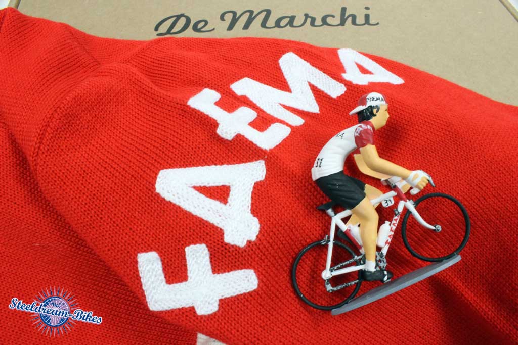 Die historischen Strickmaschinen von De Marchi sind wieder einmal angelaufen, ein wunderschönes Jersey ist entstanden; seinerzeit feierte Eddy Merckxs mit solch einem Trikot seine Siege im FAEMA Team.